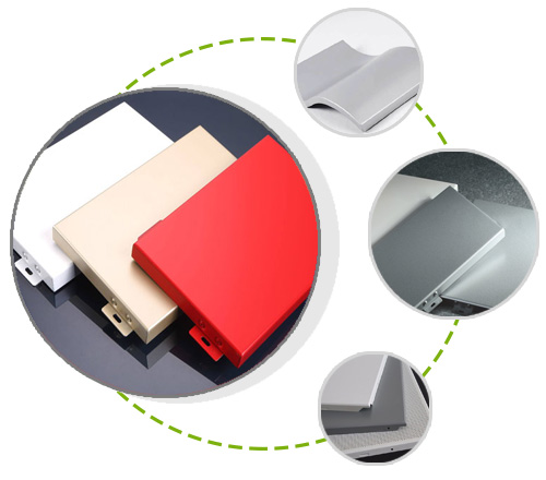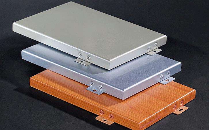 材質(zhì)復(fù)合鋁板——兩層0.5mm厚純鋁板中間夾PVC或PEC塑料輥壓,熱合而成。鋁合金單板——2~3mm鋁合金板。氟碳涂層復(fù)合鋁板——一次性輥印而成,涂層厚一般為20μm。鋁合金單板